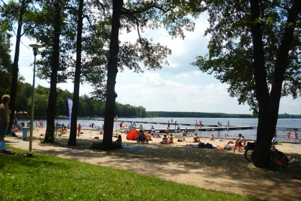W sezonie letnim w piękny słoneczny dzień (w tygodniu) udało nam się zaparkować na parkingu pod "Piramidą" czyli bardzo blisko wejścia na teren ośrodka wypoczynkowego, parking jest także po drugiej stronie ulicy, parkingi są bezpłatne. W ciągu dnia (także i po południu) nad jeziorem przewinęło się sporo ludzi, ale nie narzekaliśmy na tłumy: jest tu na tyle przestronnie że spokojnie można było bawić się na wszystkich placach zabaw, bez problemu rozłożyliśmy koc w cieniu blisko wodnego placu zabaw i posiedzieliśmy na plaży.