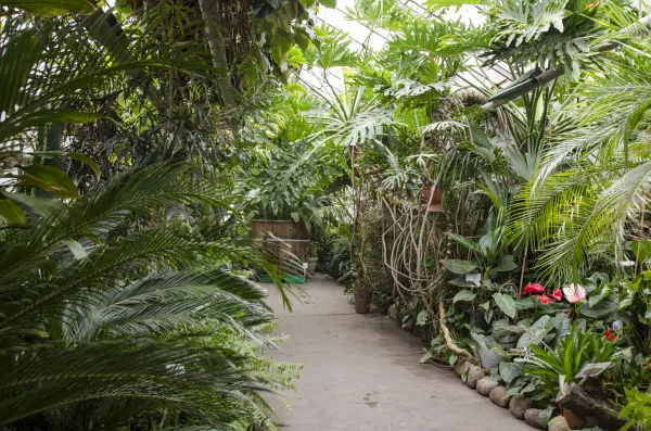 Znajdziemy tu między innymi draceny, filodendrony, palmy a wśród nich m.in. palmę daktylową, rośliny sukulentowe i wilczomleczowate, agawy (z których jedna zakwitła dwa lata temu), aloesy, kolekcję kaktusów i egzotycznych roślin zielnych, rośliny dekoracyjne jak kliwie czy anturium, a także kącik lian. Jest tu wiele roślin, które uprawiane są także w warunkach domowych, jednak nie osiągające w nich takich rozmiarów jak klasyczny fikus sprężysty (który nie dość że owocuje to osiągnął tu już wielkość drzewa) lub równie imponujących rozmiarów fikus dębolistny czy sporych rozmiarów jukka.