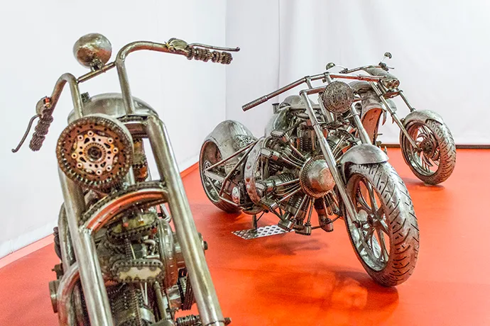 Tysiące stalowych elementów - kół zębatych, elementów skrzyń biegów, klocków hamulcowych, łańcuchów, wszelkiego rodzaju przekładni, śrub oraz nakrętek złączonych razem przybrało konkretne kształty. Jakie? Na każdej wystawie możecie zobaczyć postacie z bajek, filmów science fiction, świata fantasy, zwierzęta, znanych ludzi, motocykle czy modele luksusowych marek samochodów w skali 1:1. Rzeźby są duże, ciężkie, ale naprawdę urocze. A ogrom pracy włożonej w ich powstanie zrobił na nas wielkie wrażenie. Żadna z figur nie jest tworzona z odlewu, ani przy pomocy ciężkich maszyn, do produkcji nie są używane żadne formy. Rzeźby tworzone są w stu procentach ręcznie przy pomocy spawarek, palników, młotków i przecinarek.